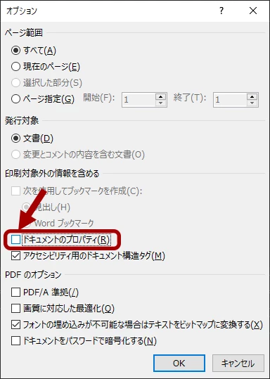 ファイル保存時、ファイルの種類で[PDF]を選ぶと、[オプション]ボタンからオプション項目一覧が開けます。[印刷対象外の情報を含める]で[ドキュメントのプロパティ]のチェックを外すと、PDF出力時にプロパティがすべて空になります。