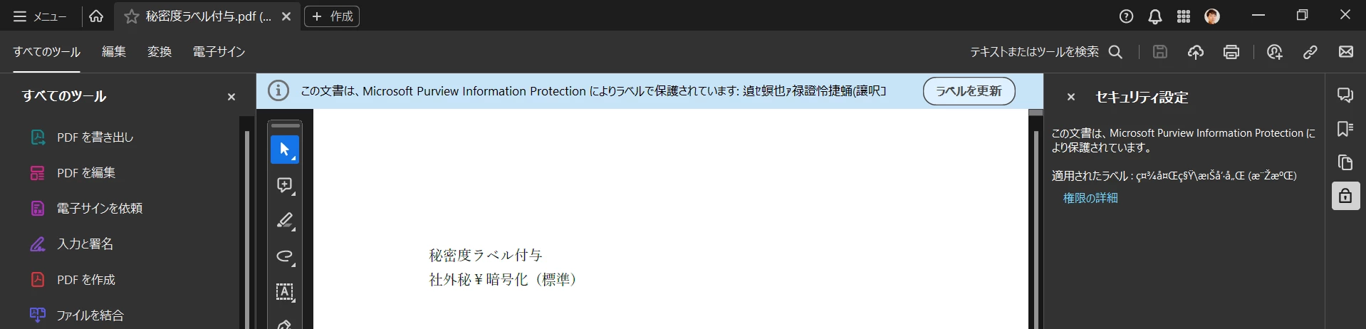 Microsoft Purview Information Protection (MPIP) の秘密度ラベルを付与した PDF ファイルを開くと、情報バーに表示される日本語の秘密度ラベル名が文字化けします。また、セキュリティ設定の適用されたラベルの表示も文字化けします。MPIP のプラグインの不具合であれば修正をお願いします。もしくは、文字化けの回避方法があればご教示願います。