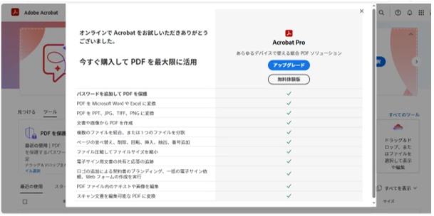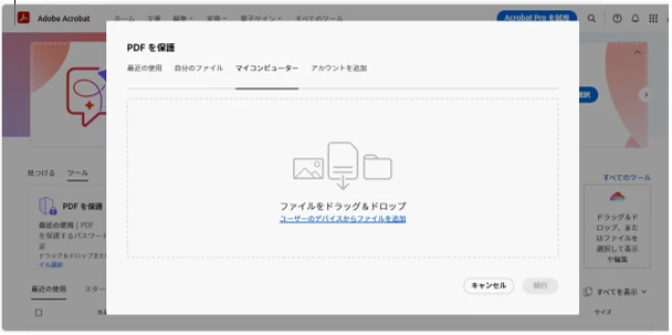 Adobe Acrobat PDF Packの年払いで契約中ですが、PDFにパスワードをかけるためファイルをアップロードすると以下の画面になってしまいます。