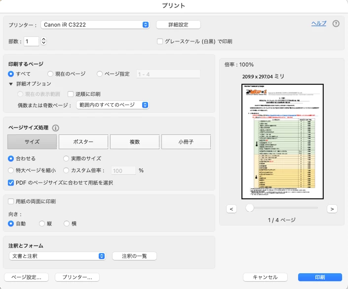 印刷プレビュー [ 209.9 ✕ 297.04ミリ ][ 100%]と表示されている。