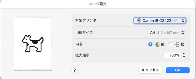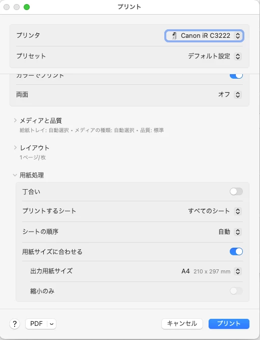 サイズ=合わせる / PDFのページサイズに合わせて用紙を選択。