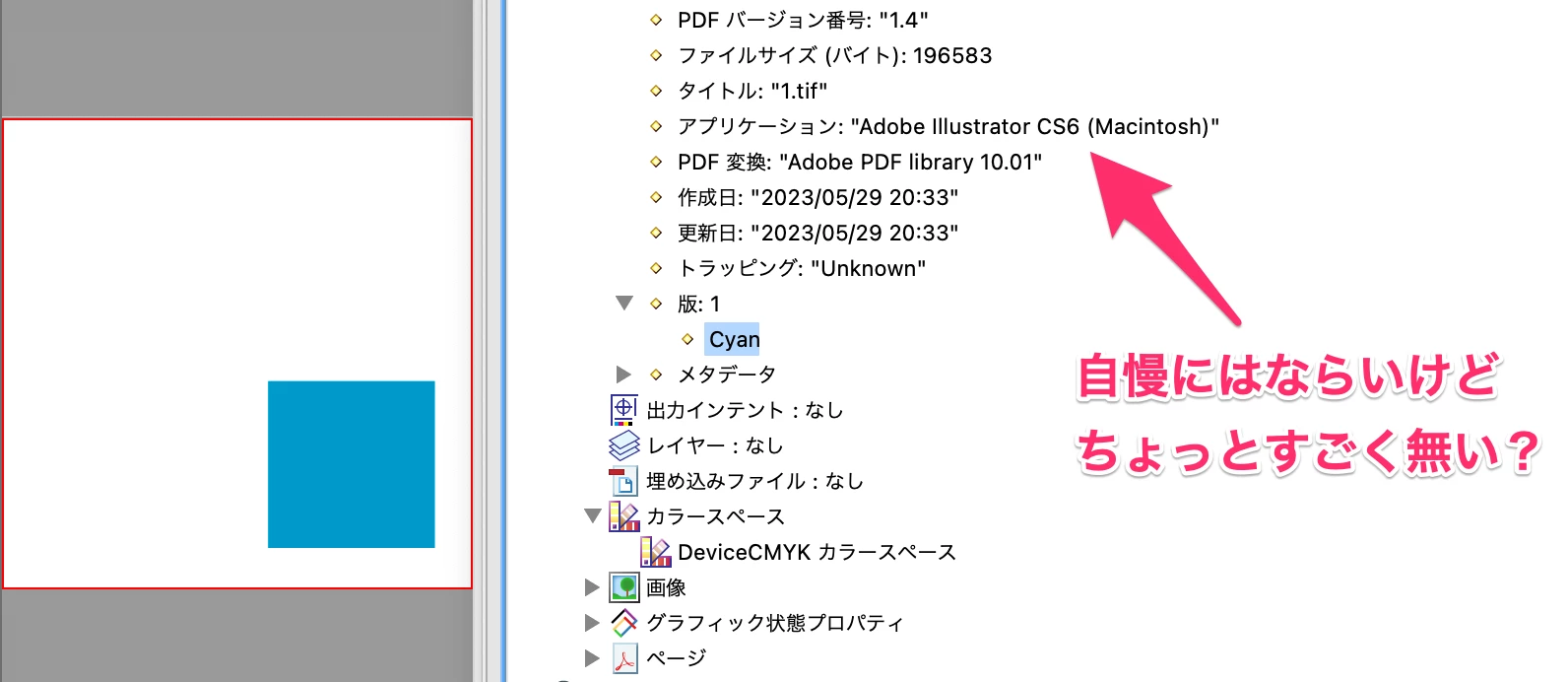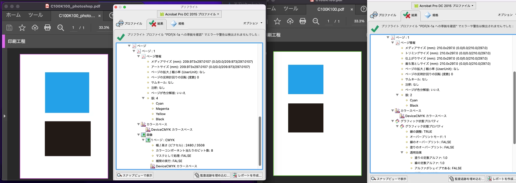 なお、Illustratorのドキュメントもトンボを付けなければ使用した版数のみが出力されていますが、トンボを付けると版数が「4」になり、「PDF/Xへの準拠を確認」のプリフライトで使用版数を調べるのはできなさそうです。