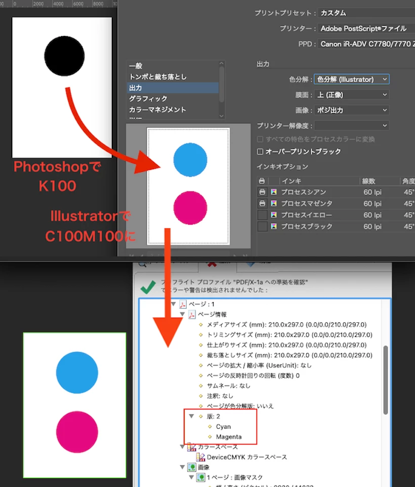 Photoshopで作成した2版(C,M)の画像をIllustratorに配置し、PDFを書き出した場合も4版になりました。