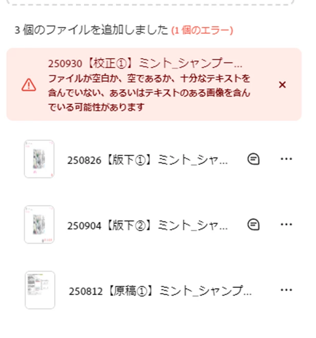 テキストありのPDFで作成したものを、校正のため、文字を埋め込んで編集できない状態にしたファイルで「ファイルが空白か、十分なテキストを含んでいない、あるいはテキストのある画像を含んでいる可能性があります。」とエラーが出てしまいます。試しに同一のファイルをOCRでテキスト化したして、挿入しても同一のファイルが出ることがあります。これはなにか回避する方法がありますか?