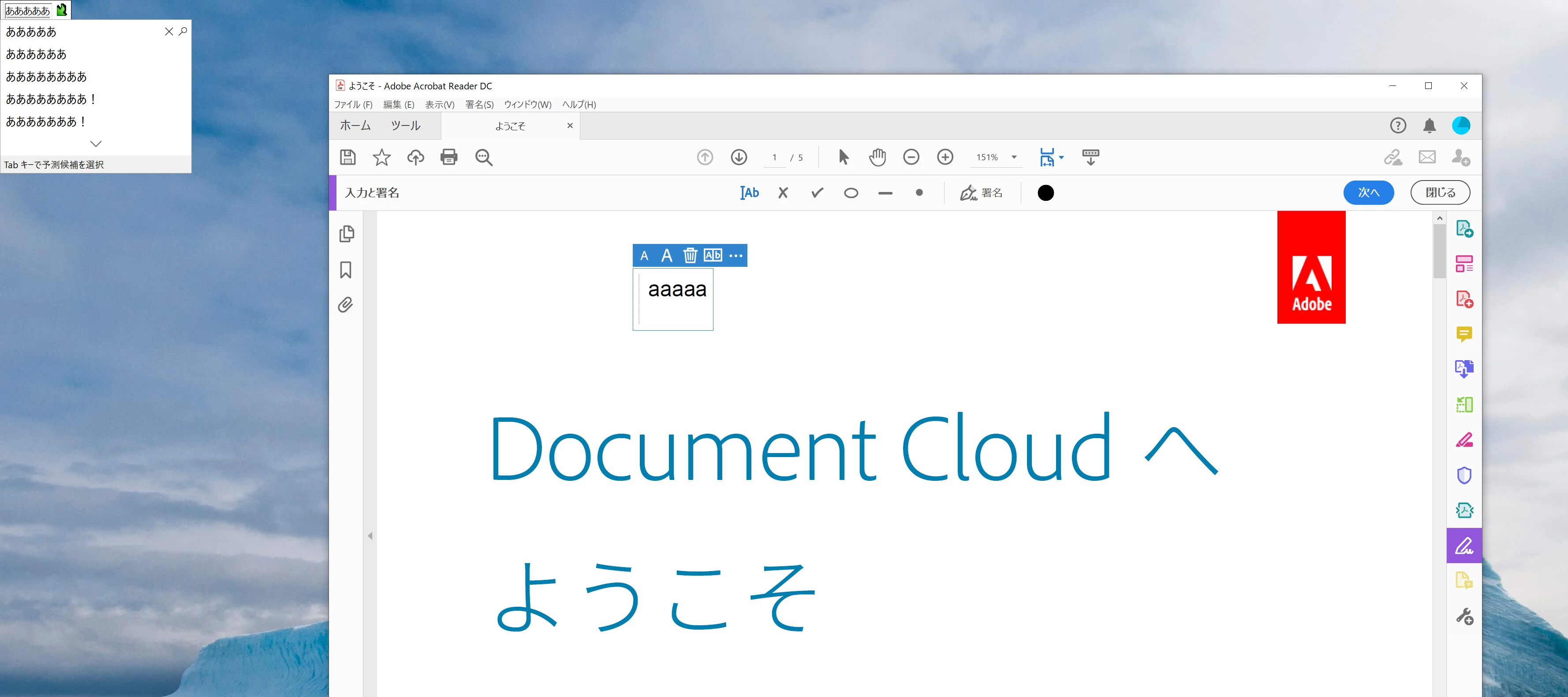 アドビリーダーで署名と入力から「テキストを追加」でひらがな入力すると画面左上に表示させる