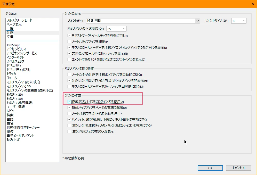 adobe acrobat reader DCにて、コメントを入力した際に表示される名前が他人(正確にはもう関りのない家族名)です。