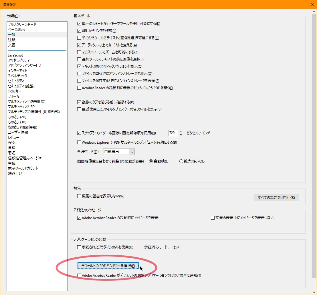 外しているかもしれないですけど,Acrobat Readerの環境設定「デフォルトのPDFハンドラーを選択」で,改めてAcrobat Readerを選択してみてはいかがでしょうか。