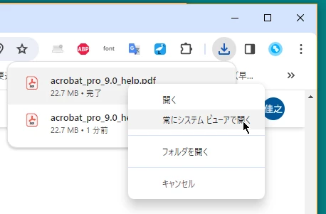 一度何かをダウンロードするとブラウザ画面右上にダウンロード完了のポップアップが出ますが,そこにあるPDFを右クリックして出てくるサブメニューで「常にシステムビューワで開く」にチェックを入れると,次回ダウンロードからはAcrobatReaderが勝手に起動・表示してくれると思います。ポップアップでなく,ダウンロード履歴からも設定できます。