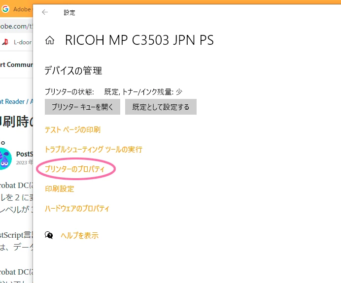 「プリンタのプロパティ→」より後の設定は,お使いの環境ごとに異なるためリコー製の複合機を使っている私にはよくわかりません。Windowsの「設定」上でプリンタのプロパティのPostScript言語レベルを「2」に設定しているにもかかわらず,Acrobat Readerのデフォルトが「3」になってしまうようだと,ちょっと理由がわからないです。すみません。