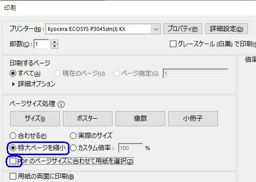 そのため既定のまま印刷すると、用紙サイズエラーになることがあり、その度に「ページサイズ処理」を「特大ページを縮小」をチェックし、「PDFのページサイズに合わせて用紙を選択」のチェックを外して印刷するようにしています。