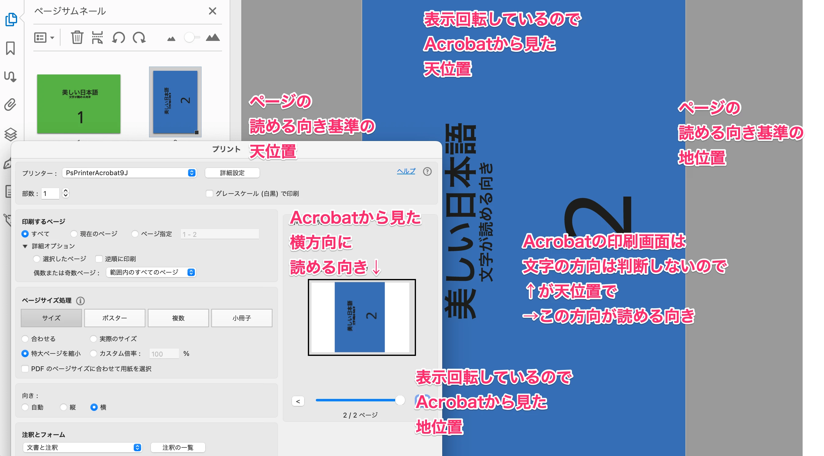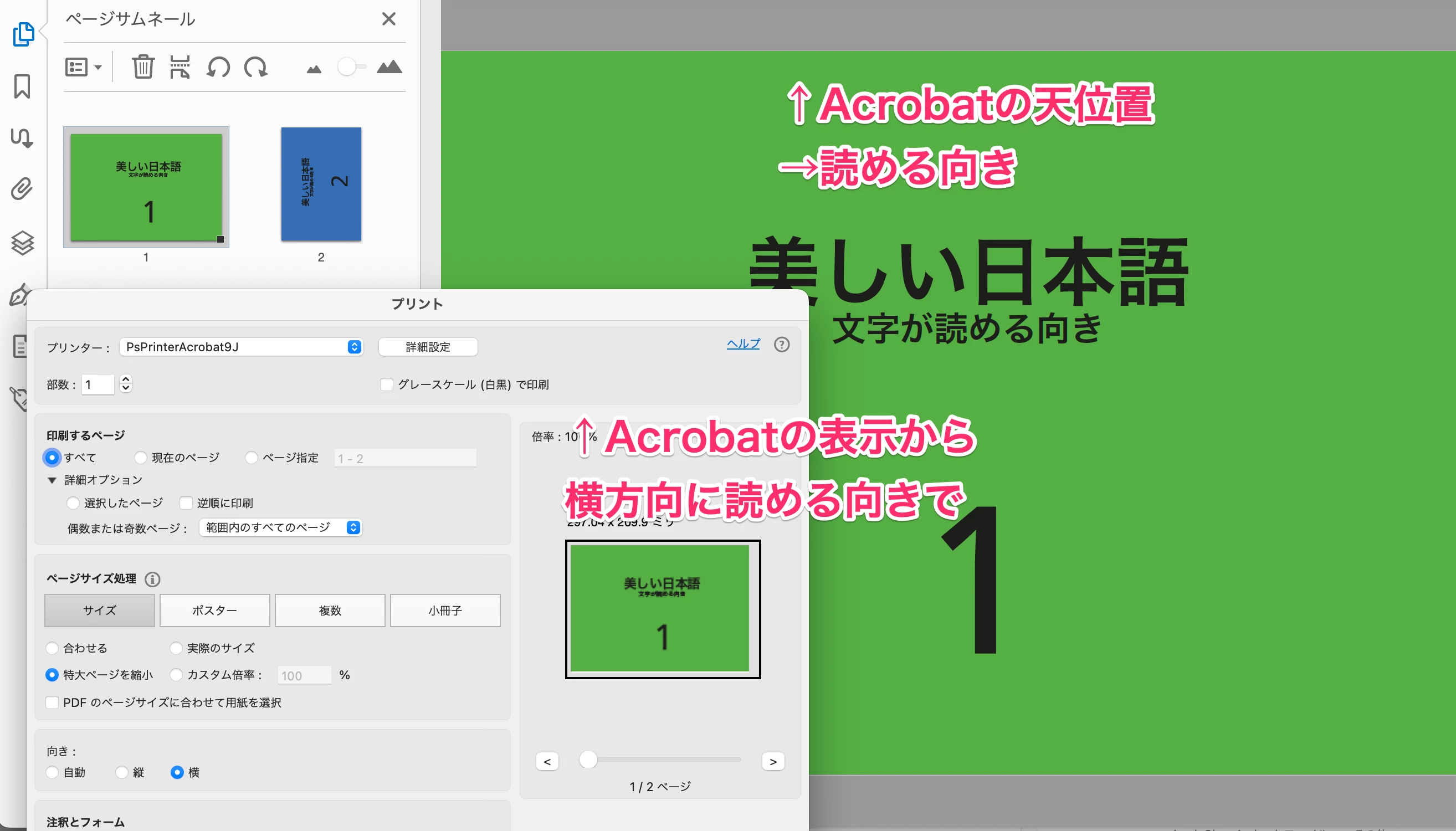 NnonsannParticipantForum|Forum|3 years agoDecember 9, 2022Question横のPDFが縦になり内容が横を向いてるForum|Forum|3 years agoDecember 9, 20224 replies24519 views1つのPDFファイルに2ページあり、印刷設定で複合し2ページを1ページに設定しPDF作成すると、横向きのPDFが縦に表示され内容が横を向きます。印刷設定で用紙を横にすると、用紙は横になりますが内容が縦に向いたままで作成されます。直前までの作業は、横に表示され保存されていましたが急に縦向きで内容が横になりました。ネットで調べ、再インストールもしましたが直りません。どうしたら直るでしょうか。