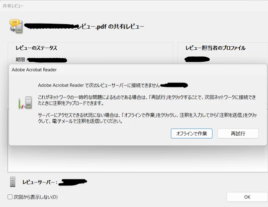 Acrobat Readerで共有レビューを使用する際、レビューサーバーにアクセスできない事例が発生しました。特定のユーザーのみです(他の方は使用可能)