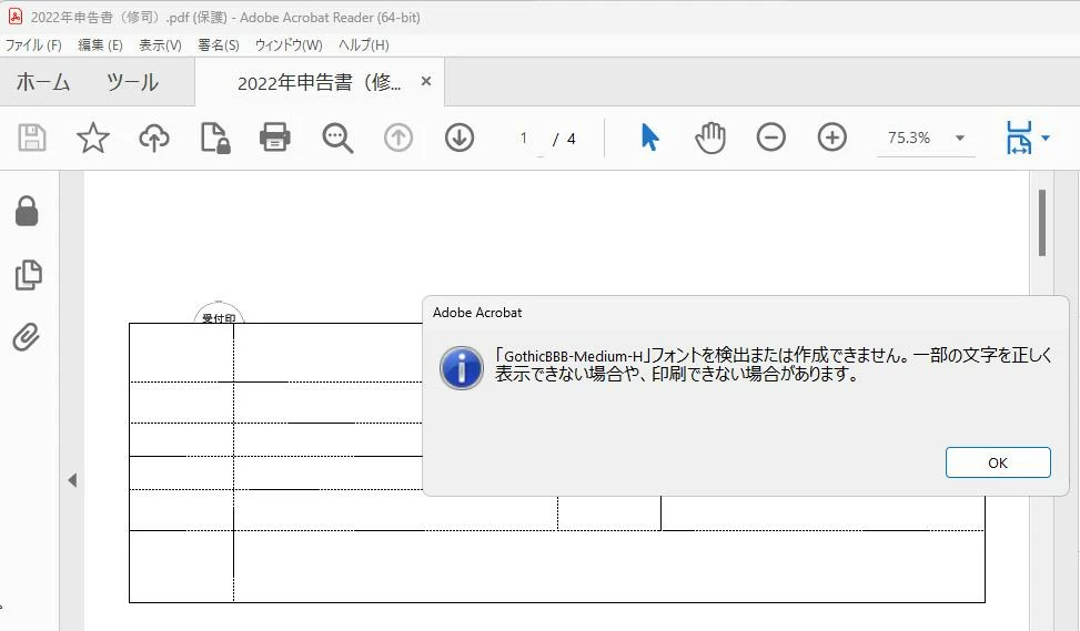 修修司28661457nlk0Participating FrequentlyForum|Forum|2 years agoMarch 1, 2023質問確定申告書の印刷Forum|Forum|2 years agoMarch 1, 2023返信数 5.5264 ビュー確定申告書を印刷しようとするフォントのエラーとなり、罫線が印刷された文字が空白のページが表示されます。環境はWindows11pro、22H2摘要の最新版です。 このPDFファイルを他のプログラム(cromeなど)で開くと正しく表示されます。 過去の確定申告書のPDFファイルを上記のエラーになります。 確定申告書以外のPDFファイルは正しく表示されます。また、Windows11homeからproにupgradeしたPCでは正しく表示されます。 よろしくお願いいたします。印刷およびプリプレス