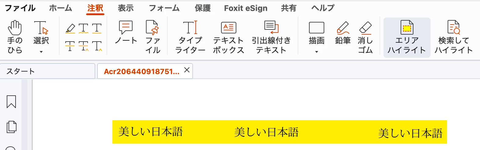 私もFoxitで確認しました。「エリアハイライト」いいですよね。