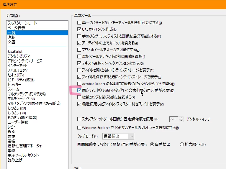 (そこで、acrobatの「環境設定」の「文書」の「他のファイルへのリンクを同じウィンドウで開く」チェックボックスを「オフ」にしたうえで、パソコンも含め再起動したのですが、いまも依然、複数のPDFが一つのacrobatウィンドウ内でタブ分けされて開いてしまう状態が続いております。)