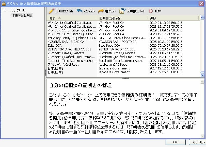 『編集』→『環境設定』→『IDと信頼済み証明書』→『信頼済み証明書』→『詳細...』→