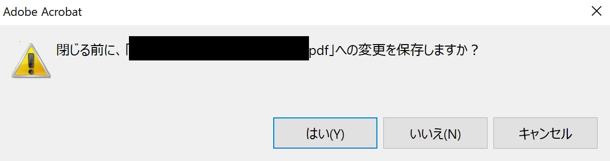 PDFファイルを起動したのみで、変更を加えてない状態で閉じようとすると、保存しますかのメッセージが表示される。