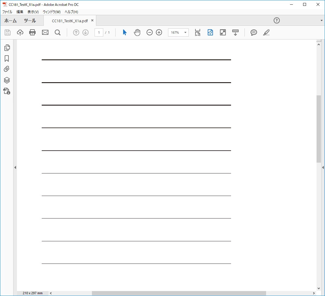作成方法:新規ファイルで、1pt~0.1ptのK100の罫線を、0.1pt刻みで配置、PDF/X-1a:2001(日本)で別名保存