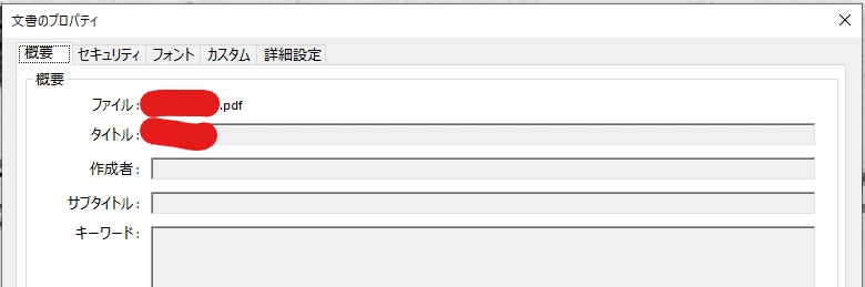 「ファイル」→「プロパティ」とクリックして「文書のプロパティ」を出したところ、