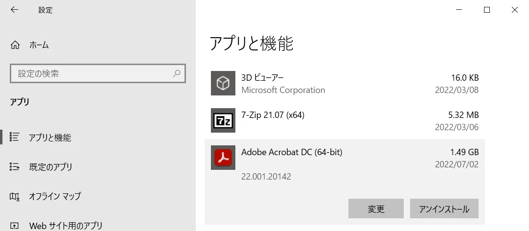 そのため、Windowsの「アプリと機能」を確認すると、ProでもReaderでもなく、「Acrobat DC」という表記に変わっています。
