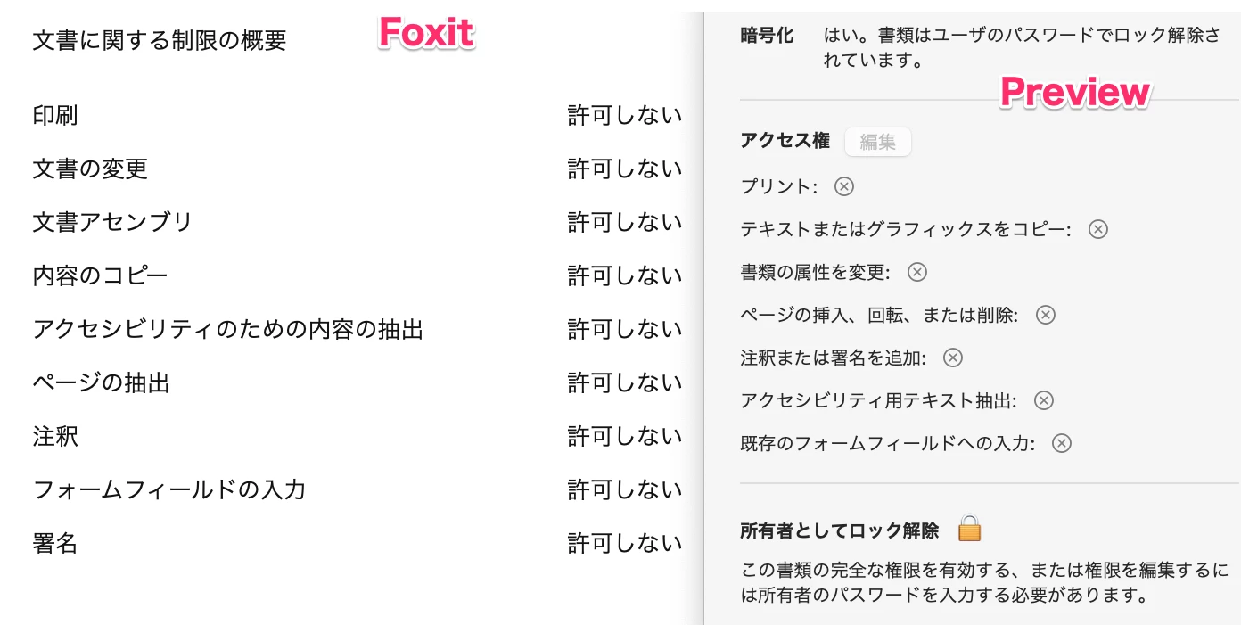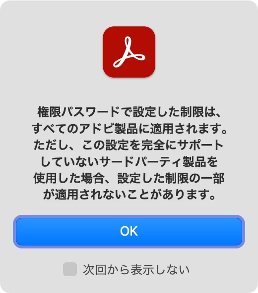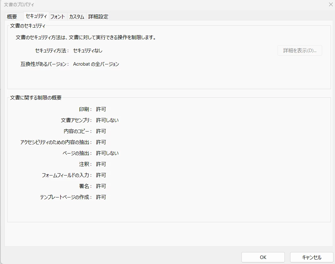 自分のAcrobat Readerで、「メニュー」→「文書のプロパティ」→「セキュリティ」タブ→「文書に関する制限の概要」を開くと、
