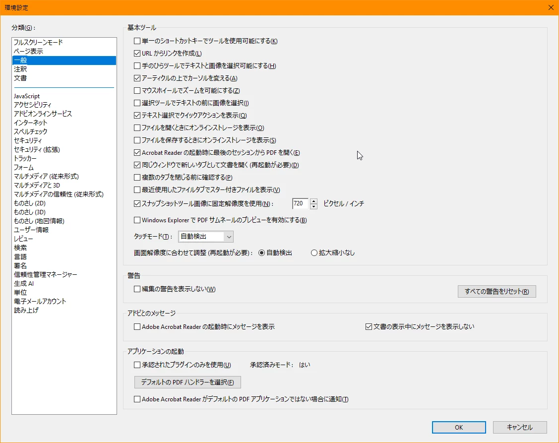 「Acrobat Reader の起動時に最後のセッションから PDF を開く」