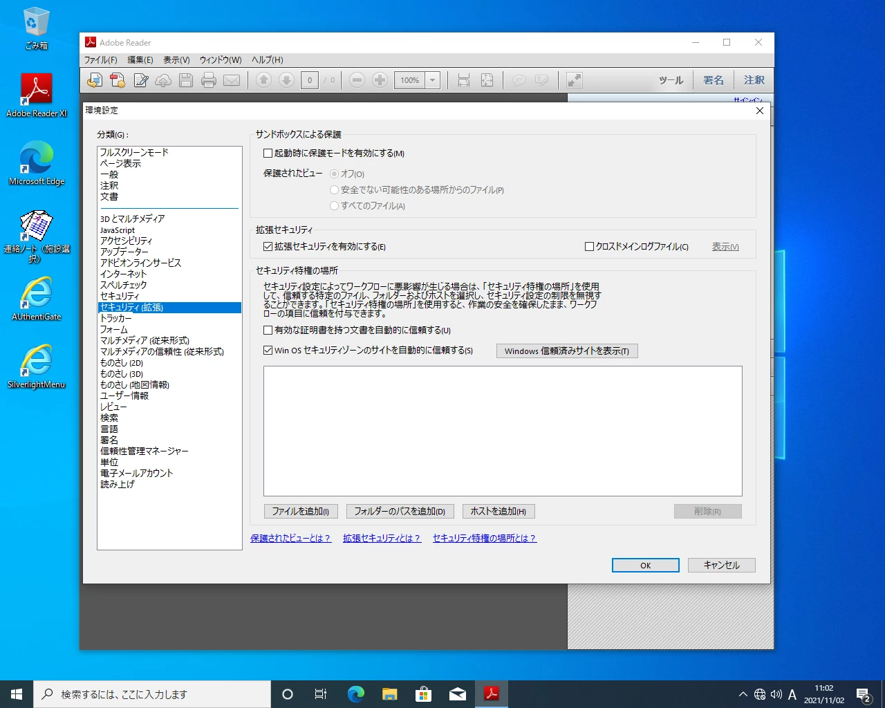 真真弥22148755cibwParticipantForum|Forum|4 years agoDecember 8, 2021質問Acrobat Reader DCにて環境設定が元に戻る現象についてForum|Forum|4 years agoDecember 8, 2021返信数 1.4663 ビューWindows10(20H2)に変わってからWebブラウザ(IE11)でPDFを開くと印刷ボタンを押しても反応しなかった為、ドメインユーザーアカウント毎に、Acrobat Reader DCの環境設定→セキュリティ(拡張)→「起動時に保護モードを有効にする」のチェックを外す作業を行ったが、あるアカウントで環境設定が元に戻った現象が発生したようです。環境設定が元に戻るといった現象は発生するのでしょうか?また、ドメインサーバ側のポリシー設定で環境設定を変更する手法などありましたら教えてください。一般的なトラブルシューティング