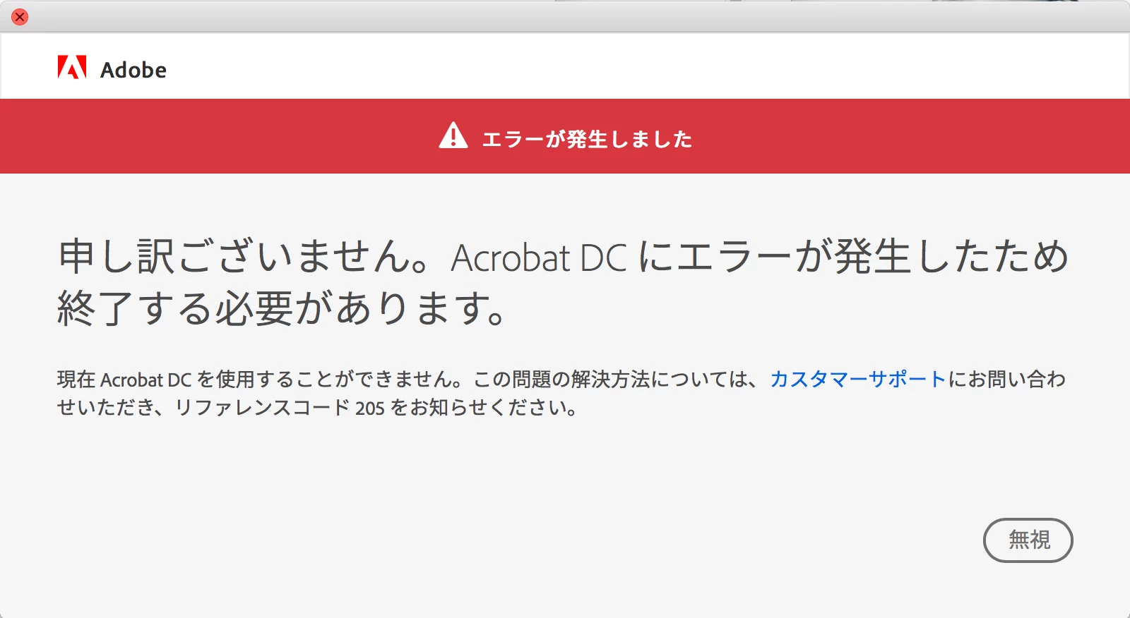 AcrobatDCでPDFを開こうとするとエラーになりファイルを開けません。MACbookを使用しておりますがこのエラーを改善する方法はございますでしょうか。