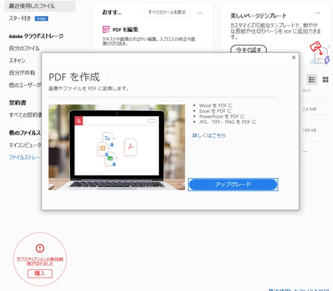 「Acrobat体験版の有効期限が切れました。Acrobatへのフルアクセス権を復元するには、今すぐ購入してください。購入するには「OK」をクリックします。