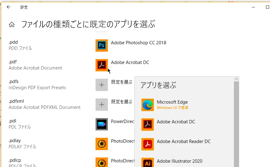 大学の講義で、講義資料をadobe acrobat readerで読み取る必要があり、インストールをしました。無事インストールができ、その講義自体は受けることができたのですが、インストールする以前に自分のpc内に保存していた全てのpdfファイルが、adobeを介してでしか開けなくなりました。また、ファイルの保存形式も acrobat document と変わってしまい困っています。