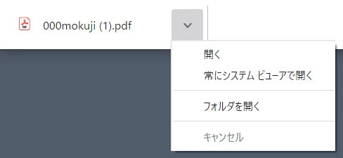 以前のバージョンでは、この設定で、いきなりファイルが開いていたのですが、現在のバージョンでは、ダウンロード後に右上に↓のポップアップが出てきて、ここで「開く」をクリックすると、Windowsで関連付けしているアプリで開くようになります。