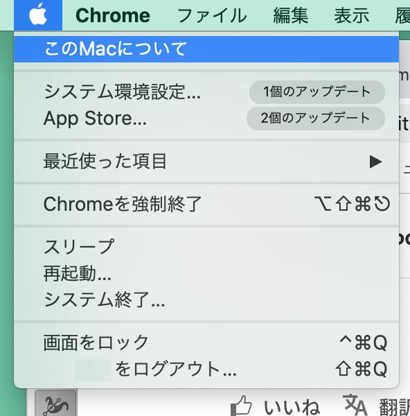 画面左上のりんごマークから「このMacについて」をクリックしてみてください。