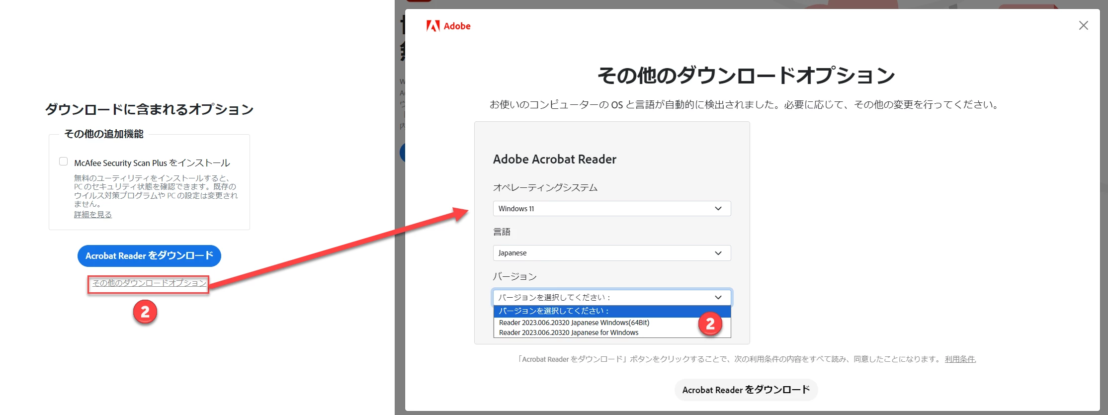 Adobe Acrobat Readerのダウンロード画面でバージョン選択ができない