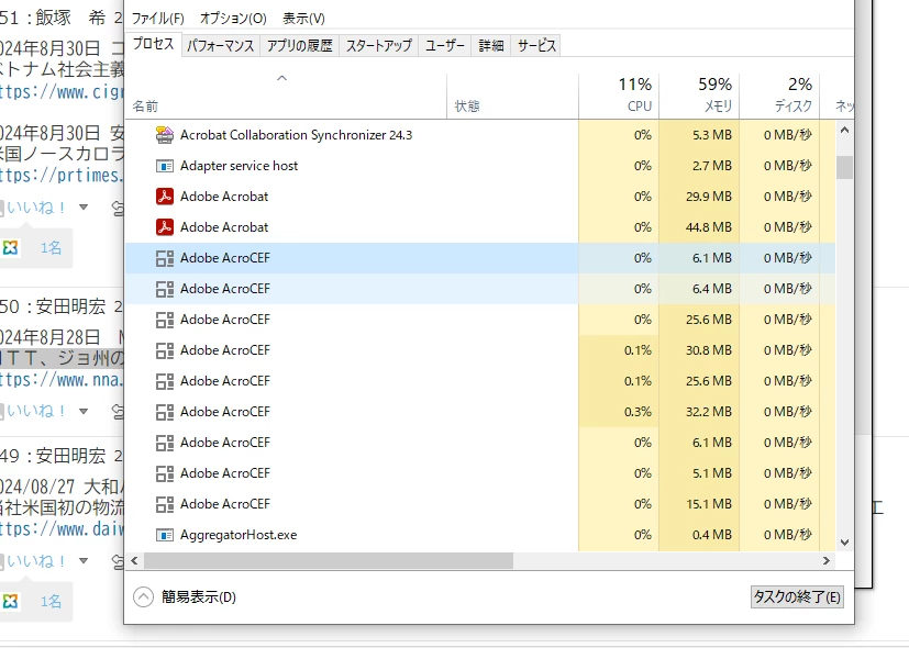 Excel等でカナ入力実施中に、カーソルがクルクルした動作(バックグラウンドで何が動いたているような挙動)をし、タスクマネージャーを確認すると、「Adobe Acrobat」「Abobe AcroCEF」のプロセスが大量に発生しており、カナ入力が自動的に確定してしまう状況。