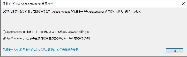 Acrobat Reader初回起動時に確認メッセージ「保護モードでのAppContaierの非互換性」が表示されました。確認メッセージ上の「AppContainerが保護モードで無効になっている場合にAcrobatを開く」をクリックすると起動できます。