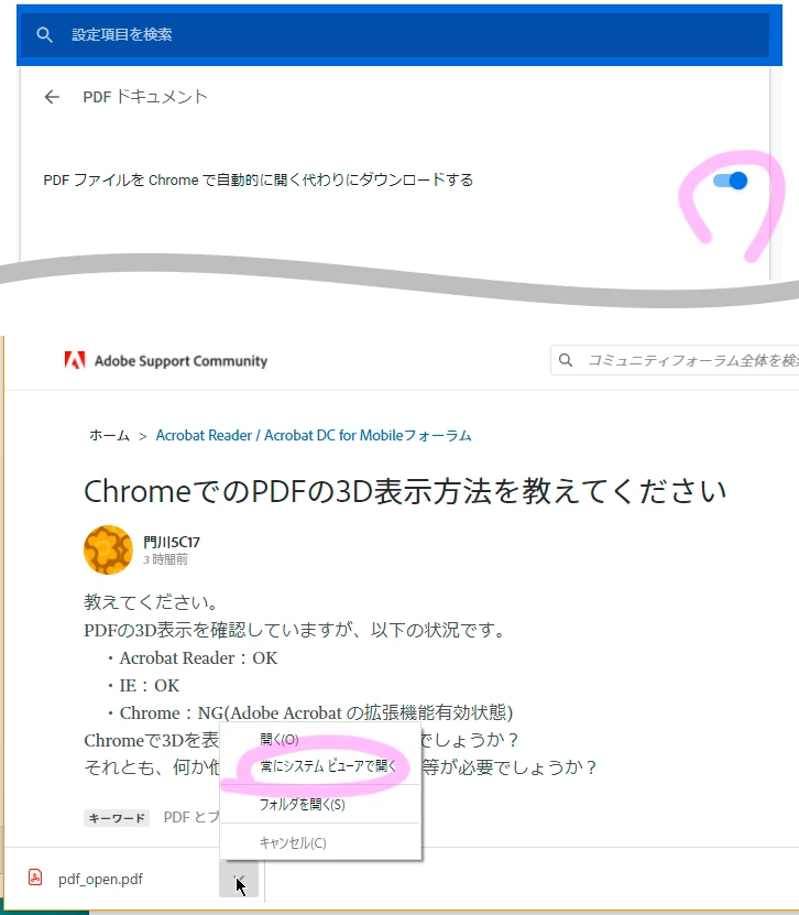先に、Google Chromeの「Adobe Acrobat の拡張機能」はこの件には無関係です。