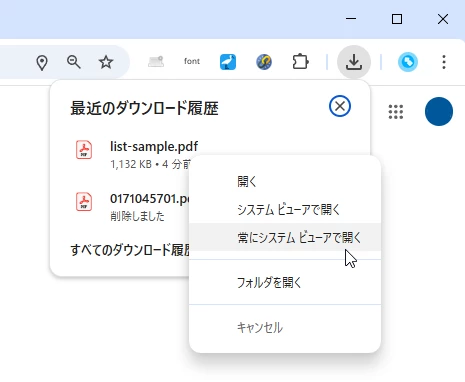 原因としてひとつ考えられるのはChromeの設定です。もしここ(ダウンロード履歴にあるPDFファイルを右クリックすると出てくる「常にシステムビューアで開く」)にチェックが入っていたらオフにしてみてください。すでにオフの場合はごめんなさい~
