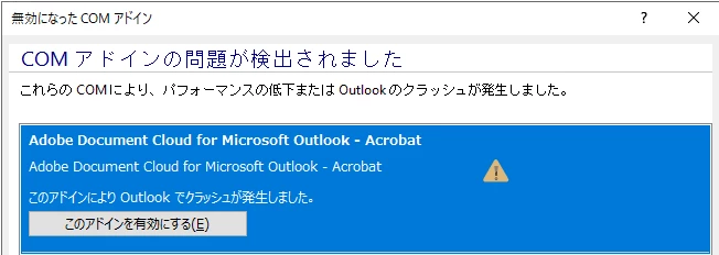 OutlookのCOMアドイン「Adobe Document Cloud for Microsoft Outlook Acrobat」がクラッシュする