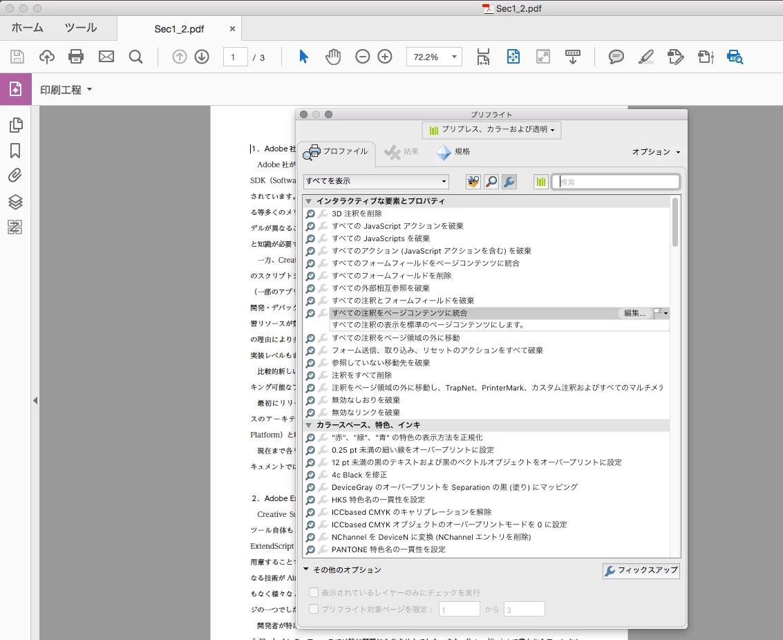 Acrobat Pro DCならプリフライトパネルのフィックスアップ「すべての注釈をページコンテンツに統合」から処理できます。