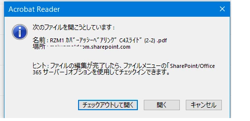 SharePoint内のPDFファイルを開く際にチェックアウトが表示されない