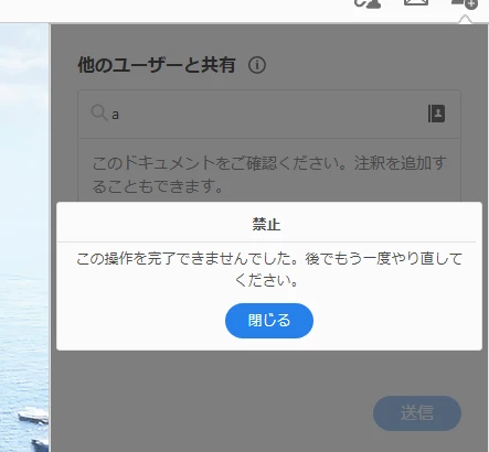 Document Cloudで文書を共有化しようとした際、「禁止 この操作を完了できませんでした。後でもう一度やり直してください。」というエラーが出て共有化できません。