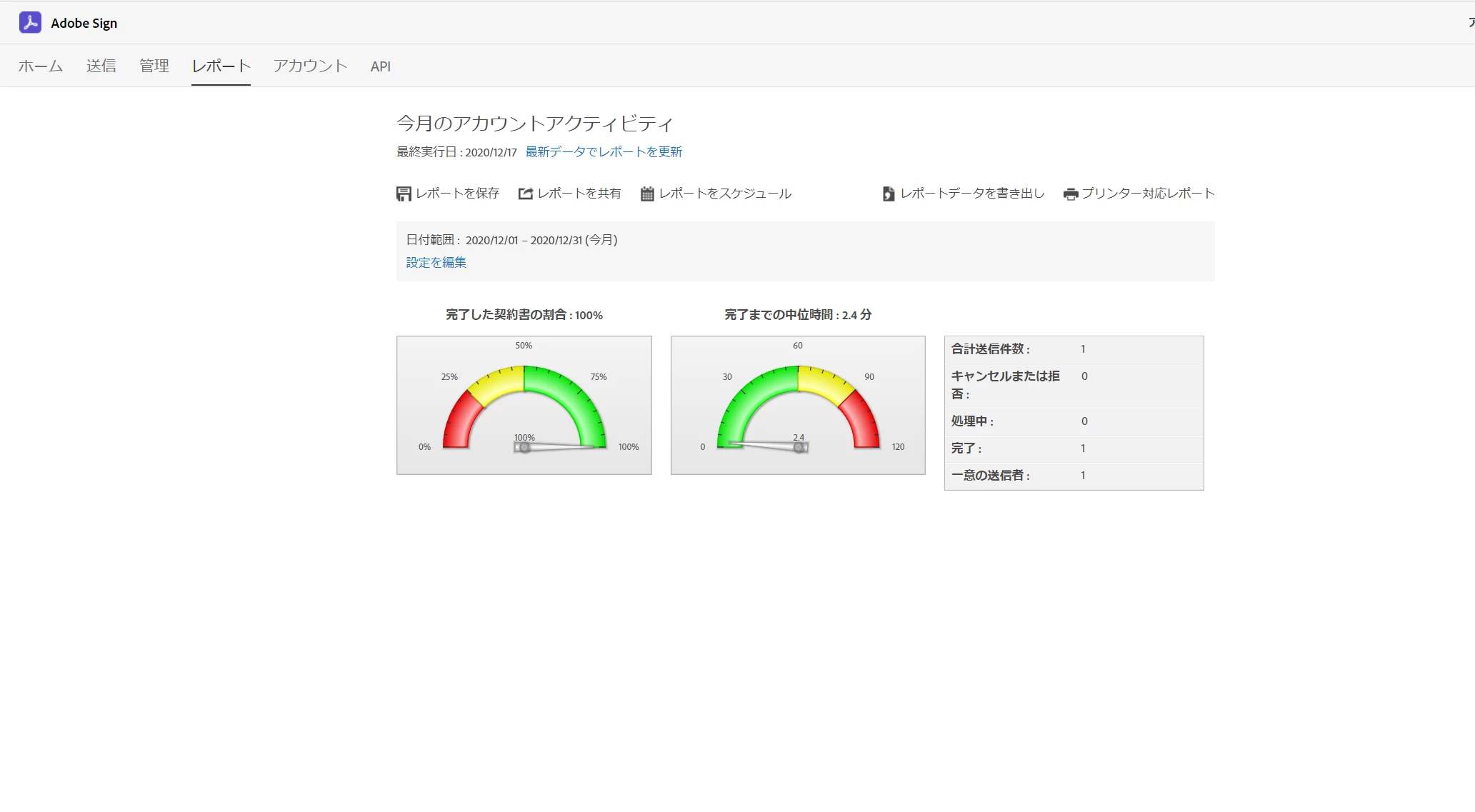 Adobe Signにサインインするとレポートを確認できます。