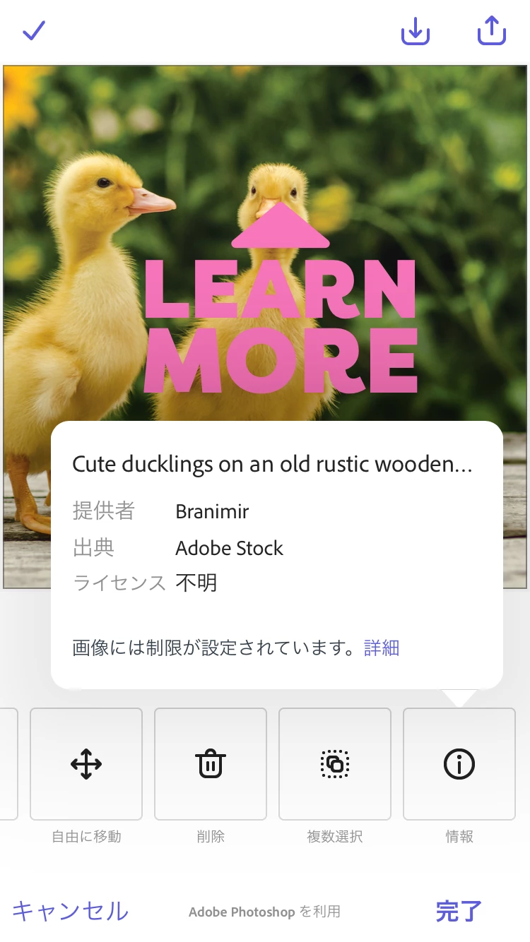 *通常、Adobe Stockのアセットに限定ライセンス- Adobe Expressが付属している場合、Adobe Expressアプリ内で検索すると、アセットに王冠のアイコンが表示されます。Adobe Expressプロジェクトにアセットをインポートした後にライセンスの種類を確認するには、プロジェクトでアセットを選択し、「ソース情報」アイコンをクリックします。