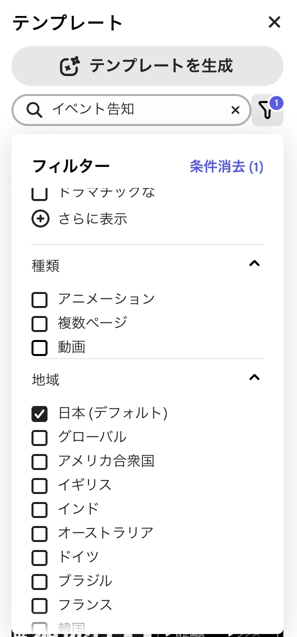 テンプレートを検索する前に、いま作っているデータと同じもしくは近いサイズの「アセット」の「すべて表示」を選んでから、検索すれば、選んだアセットの中で検索されるようです。