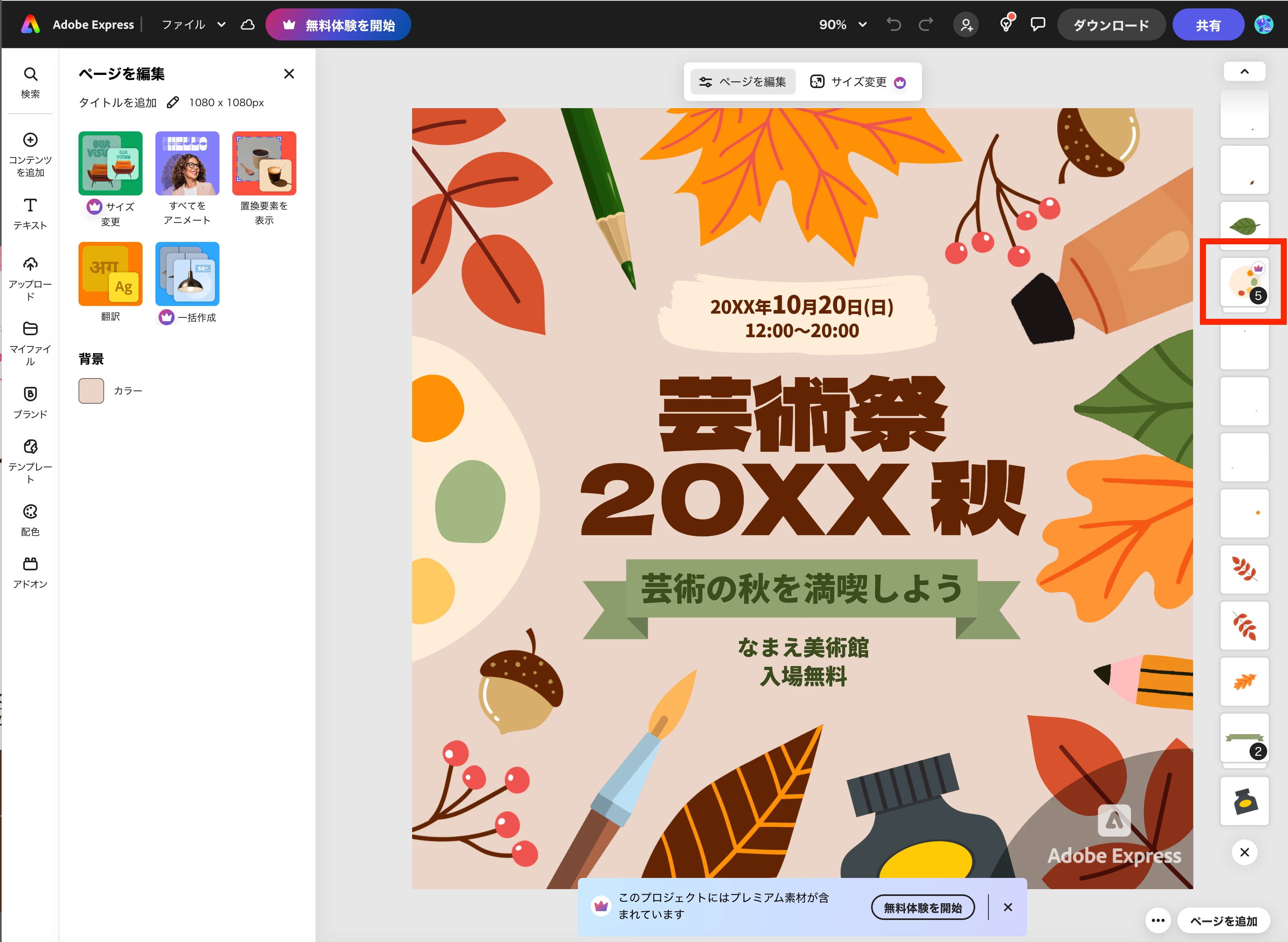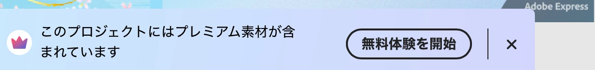ページを開くと「このプロジェクトにはプレミアム素材が利用されています」と表示され、「グレー色のAdobeロゴ」が作成した画面の右下に写ります。