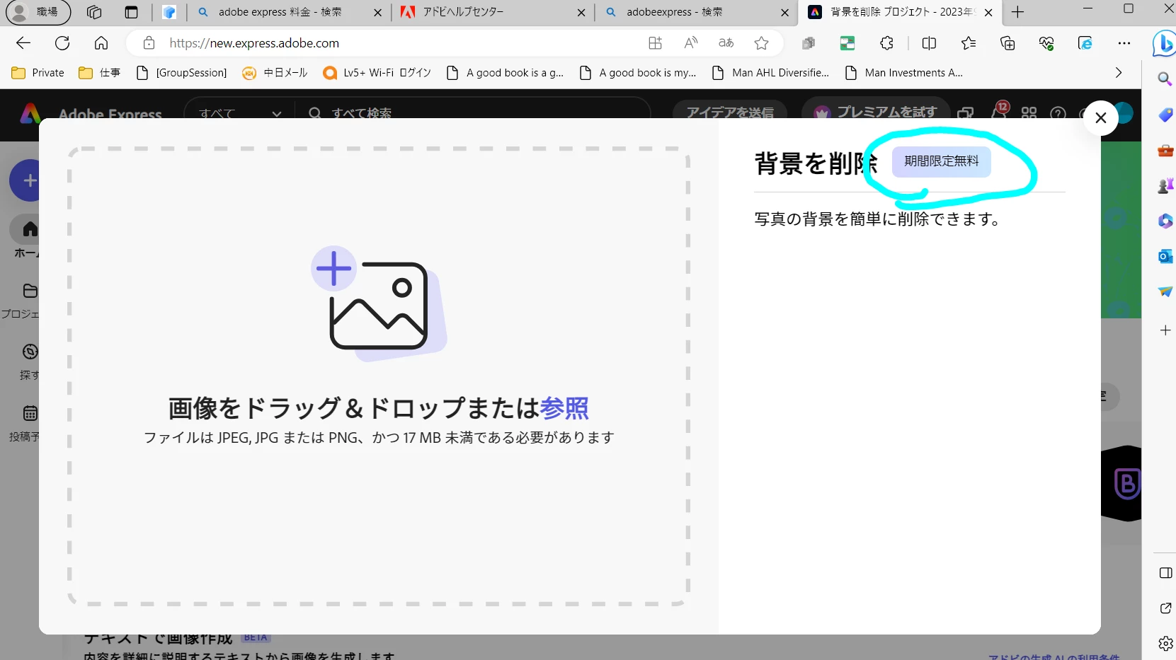 AApple09004ParticipantForum|Forum|2 years agoSeptember 11, 2023Answered「背景削除」フリープランの制限とは?Forum|Forum|2 years agoSeptember 11, 20231 reply1346 viewsADB-30888285-Q4N8 CRM:01366000015782 FAQによると、「フリープランでは背景削除機能を制限付きで利用できる。プレミアムプランでは無制限となる」との記載があります。具体的には、どのような制限があるのでしょうか? また、バージョンアップに伴い、背景削除機能の画面右上に小さく「期間限定無料」と表記されています。これはどういう意味なのでしょうか?
