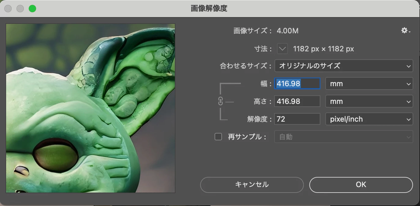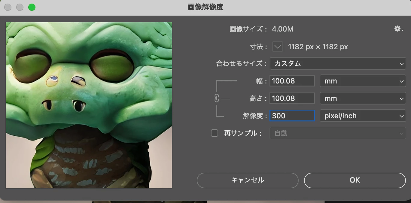 色々試した結果、どうしても72dpiで、かつ指定した印刷サイズより、とても大きなサイズで