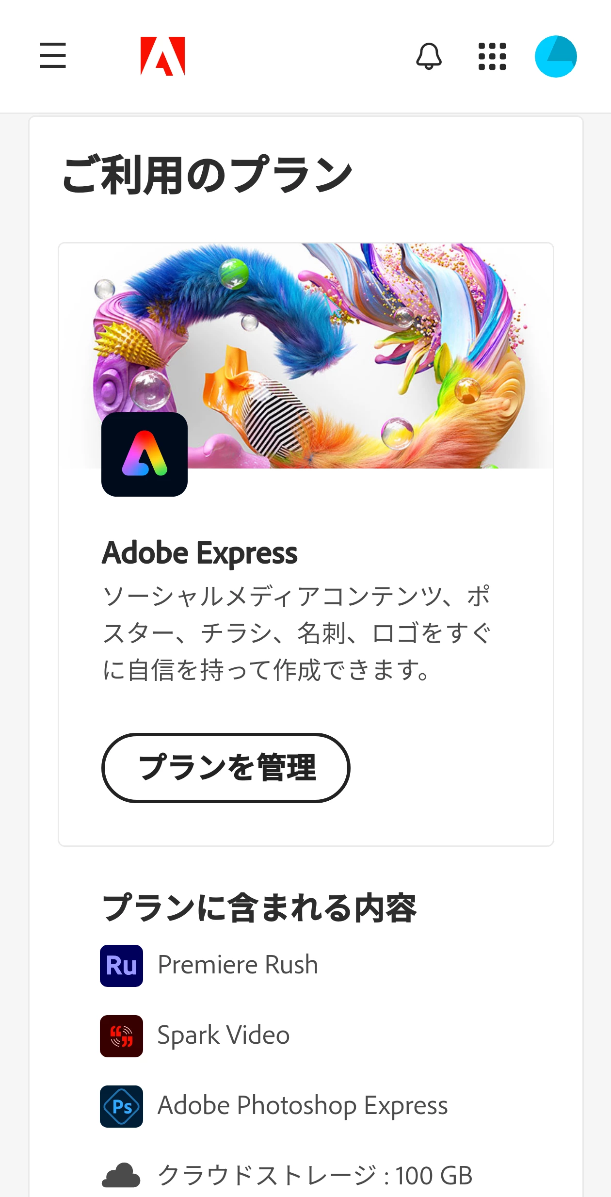 画像の通り、ご利用のプランがAdobe Expressとなっており、プランに含まれる内容にAdobeのアプリ(?)がずらっと並んでいます。