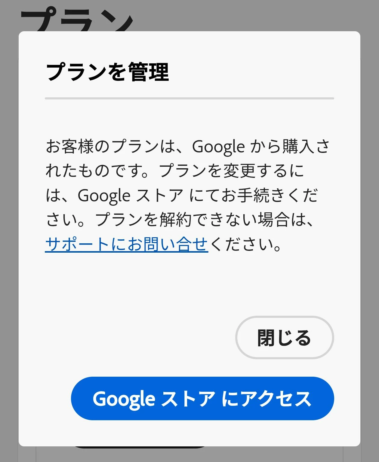 ちなみに「プランを管理」をタップするとGoogleストアにてお手続きくださいと出て、Adobeが記載されていない定期購入に飛びます。