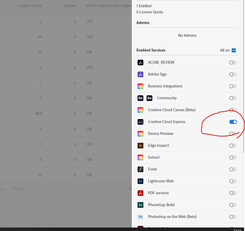Admin Console の製品プロファイルでサービスを切り替えても Creative Cloud Express にアクセスできない